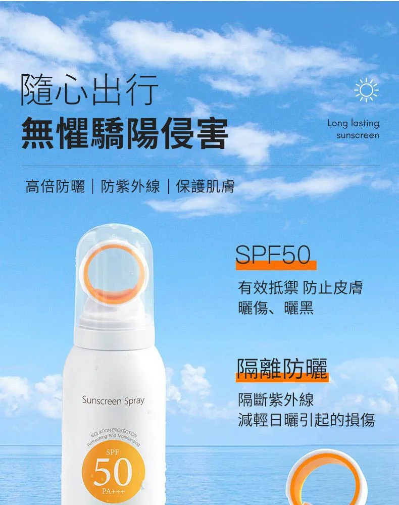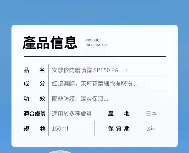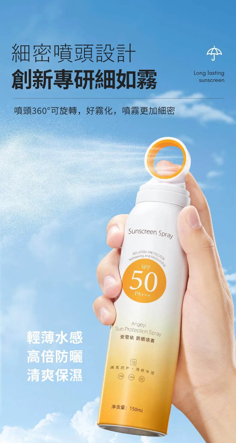 7分鐘前安歌依光圈防曬噴霧,細密噴頭設計 噴頭360°可旋轉自然膚惑,隔離防曬一瓶搞定 - 破盤嗨購「安歌依光圈防曬噴霧」6入87%用戶的選擇!NT$1398【限時免運】